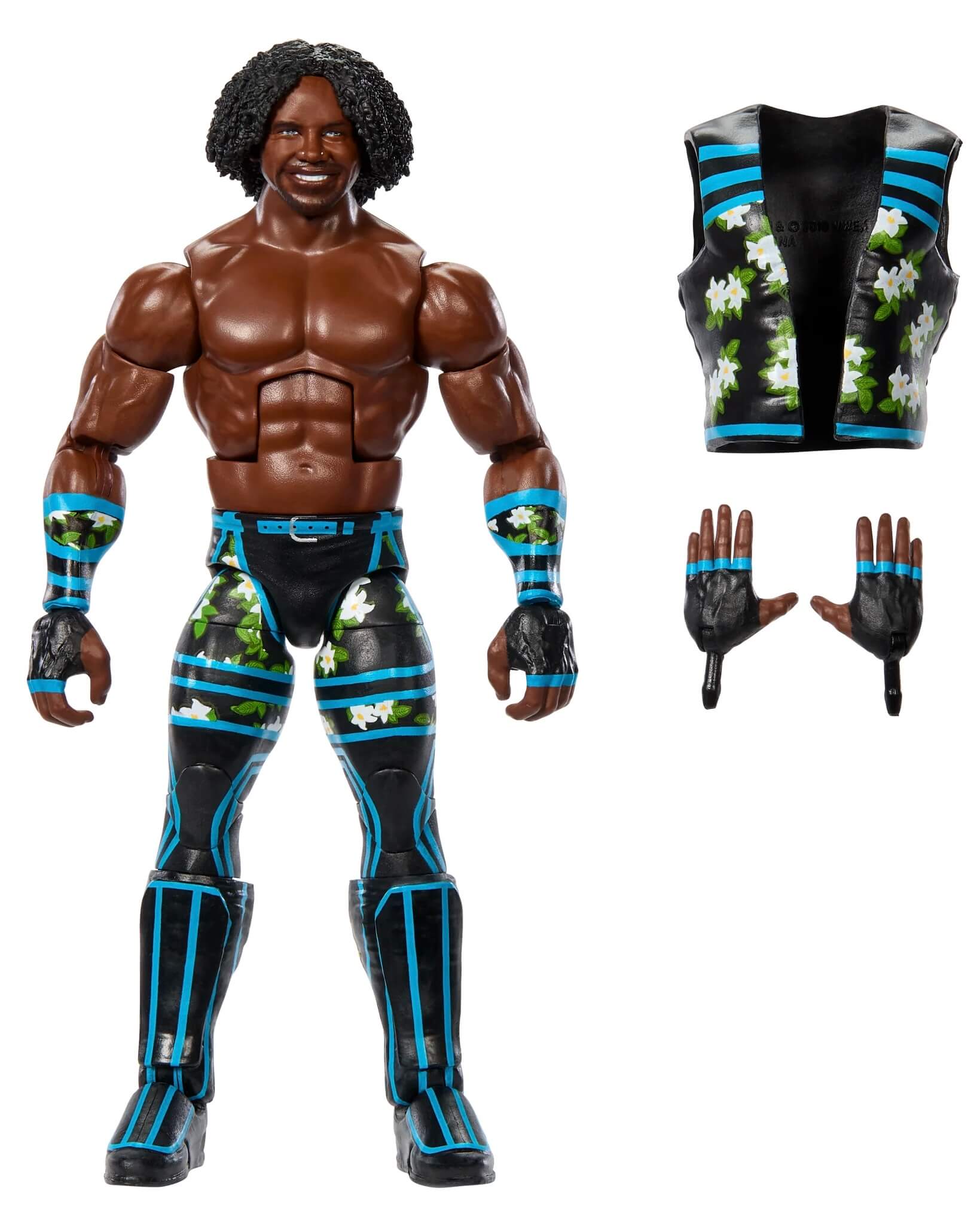 Hochdetaillierte Xavier Woods Actionfigur im Outfit von WWE Raw im August 2023.