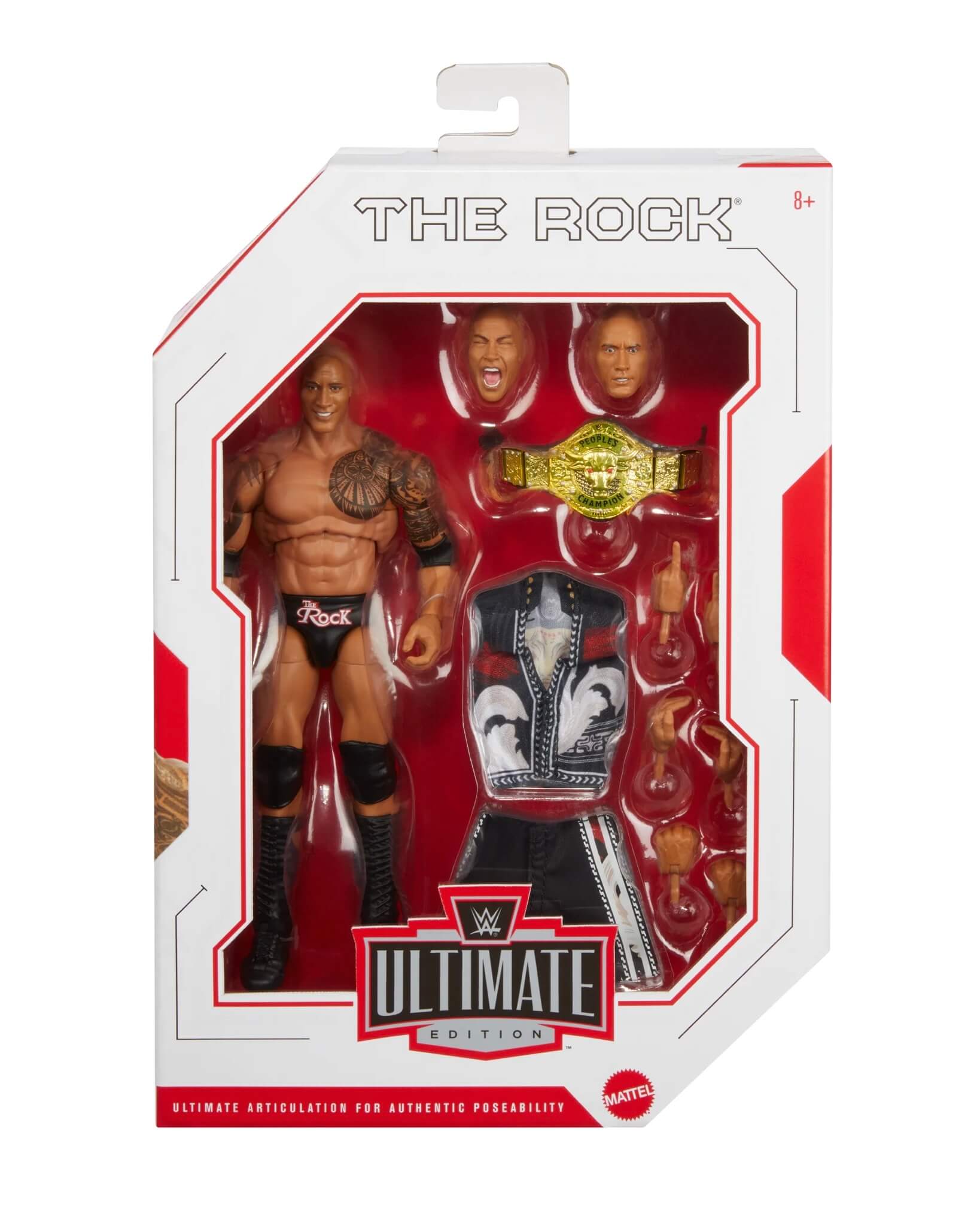 Hochdetaillierte The Rock Actionfigur im Outfit von Wrestlemania XL im Jahr 2024.
